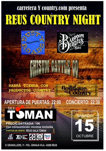 Os anunciamos la primera edición de la Reus Country Night, presentado por Carretera y Country. Este Festival se celebrará el 15 de Octubre de 2016 en la Sala Toman de Reus (Tarragona) todo un referente de la música en directo en la provincia de Tarragona.