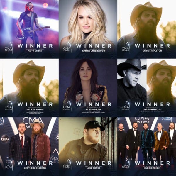 Por número de premios el gran triunfador fue Chris Stapleton con 3 premios, uniendo mejor single y mejor canción con «Broken Halos» y mejor vocalista masculino. Tanto Chris como Keith estarán en el C2C 2019.